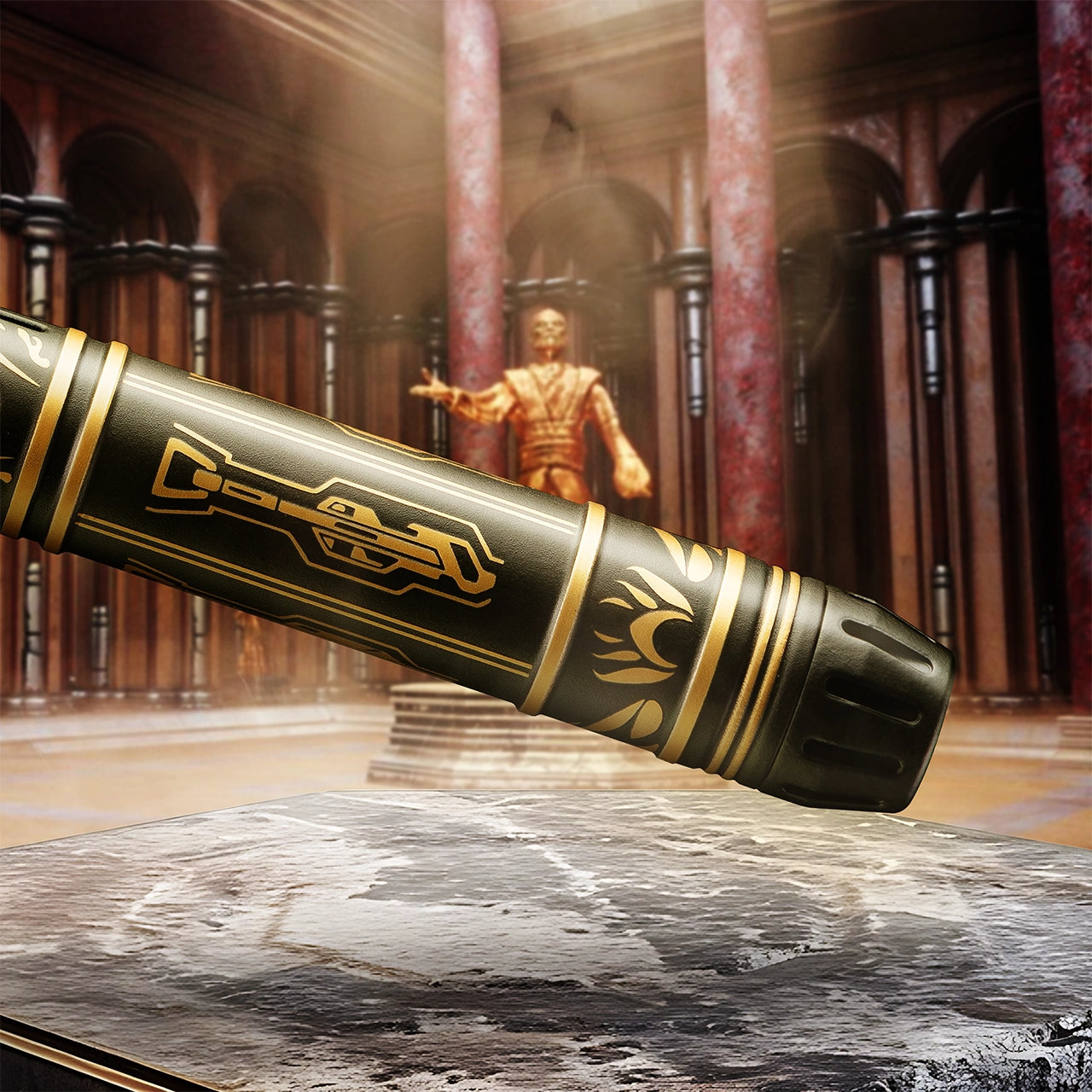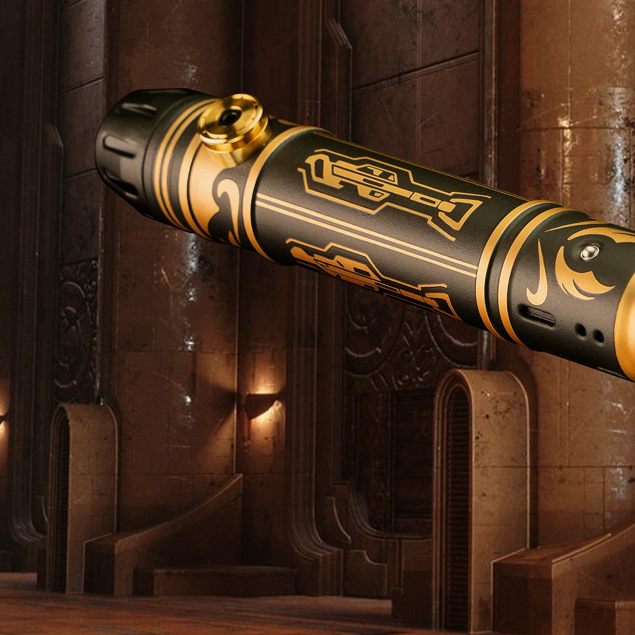 Le Sabertrio Aegis Vaapadrin Vektra évoque la grâce et la finesse au travers de ses dorures finement appliquées sur un manche noir mat. Ses arabesques rappellent les heures glorieuses de la Haute République où l'élégance était largement répandue au travers des artefacts, accoutrements et jusqu'aux sabres eux-mêmes.