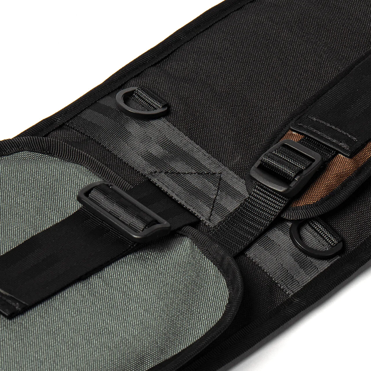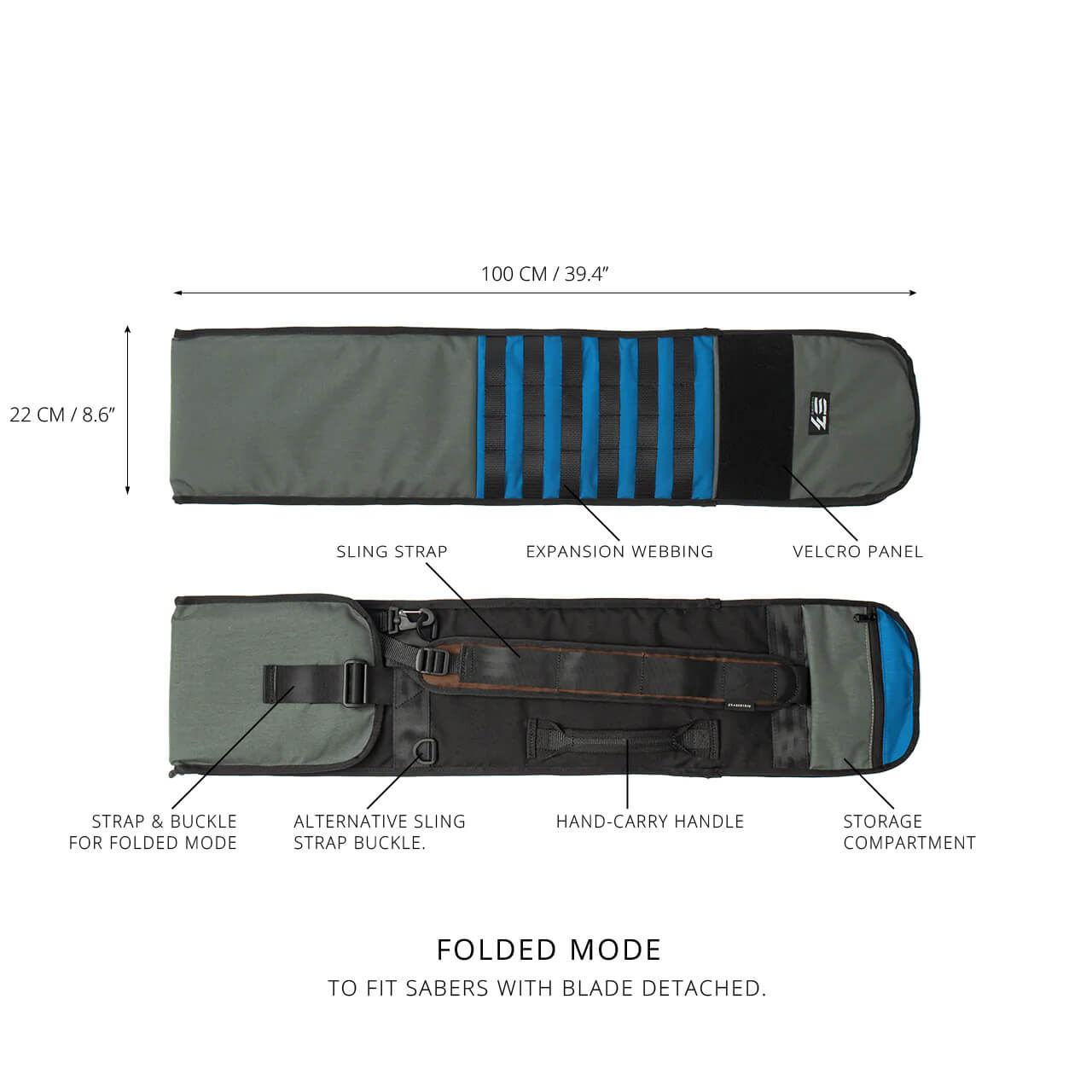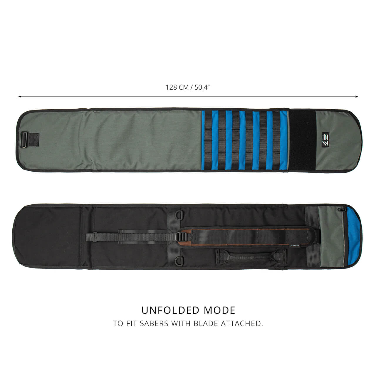 Made from Cordura nylon, an extremely durable, tear-resistant and water-repellent material. For added protection, a plush layer of EVA foam covers the interior compartment, which features two long pockets, each designed to accommodate a standard custom saber without its blade, and protect it from scratches. Multiple blades can be stored between these two pockets, or the bag can be unfolded to accommodate a complete custom sword with its blade attached.