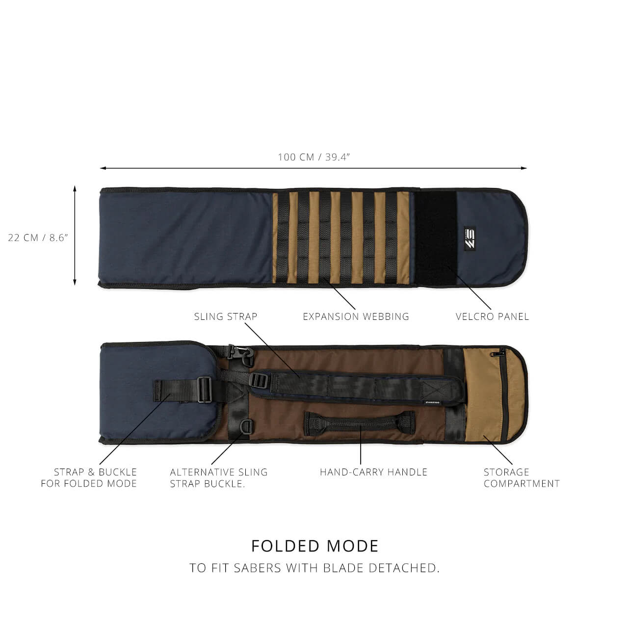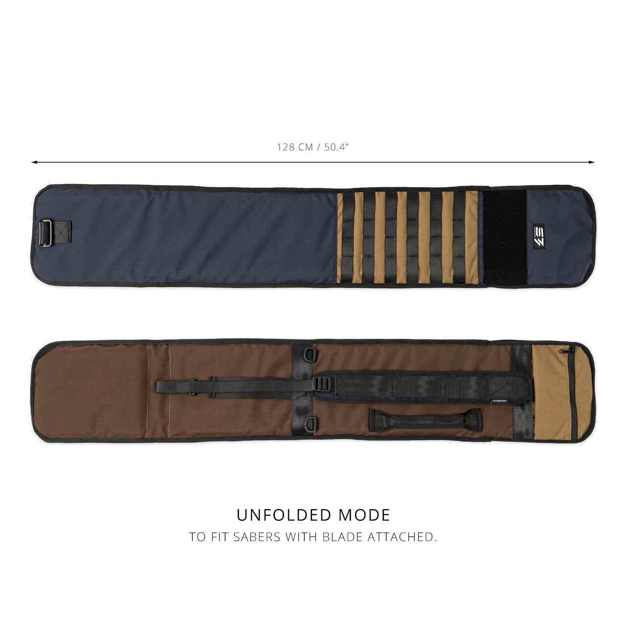 Made from Cordura nylon, an extremely durable, tear-resistant and water-repellent material. For added protection, a plush layer of EVA foam covers the interior compartment, which features two long pockets, each designed to accommodate a standard custom saber without its blade, and protect it from scratches. Multiple blades can be stored between these two pockets, or the bag can be unfolded to accommodate a complete custom sword with its blade attached.