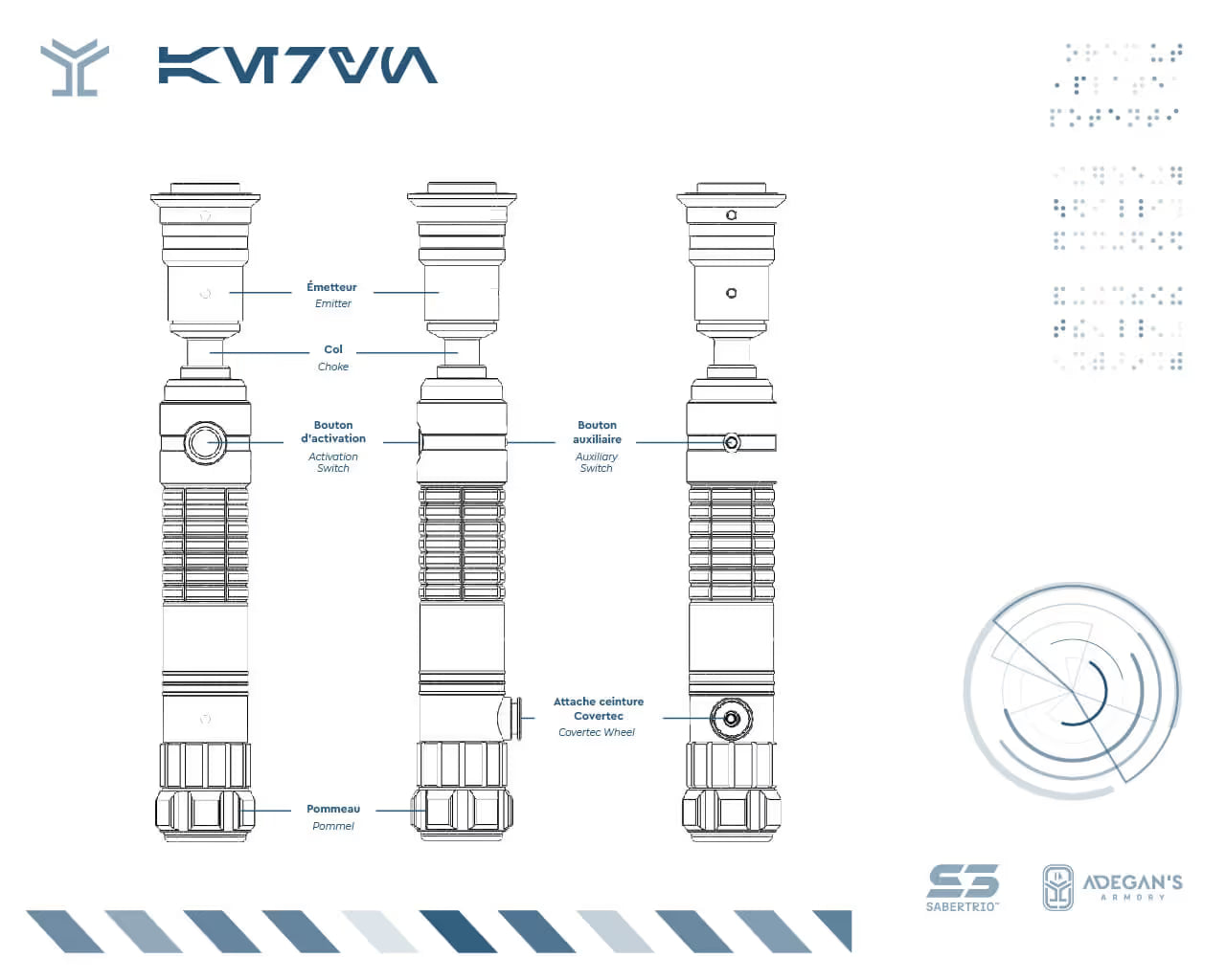 Like any field, lightsabers have their own vocabulary. In the case of those designed by Sabertrio, it's very simple: the modules are always the same, only the design changes. In general, these terms tend to become more and more standard, inspired by the saga.