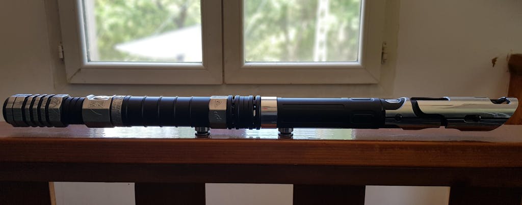 The new Sabertrio coupler is an accessory that allows you to combine two lightsabers by attaching them to the bottom of each hilt form a double saber. It is compatible with all Sabertrio sabers.