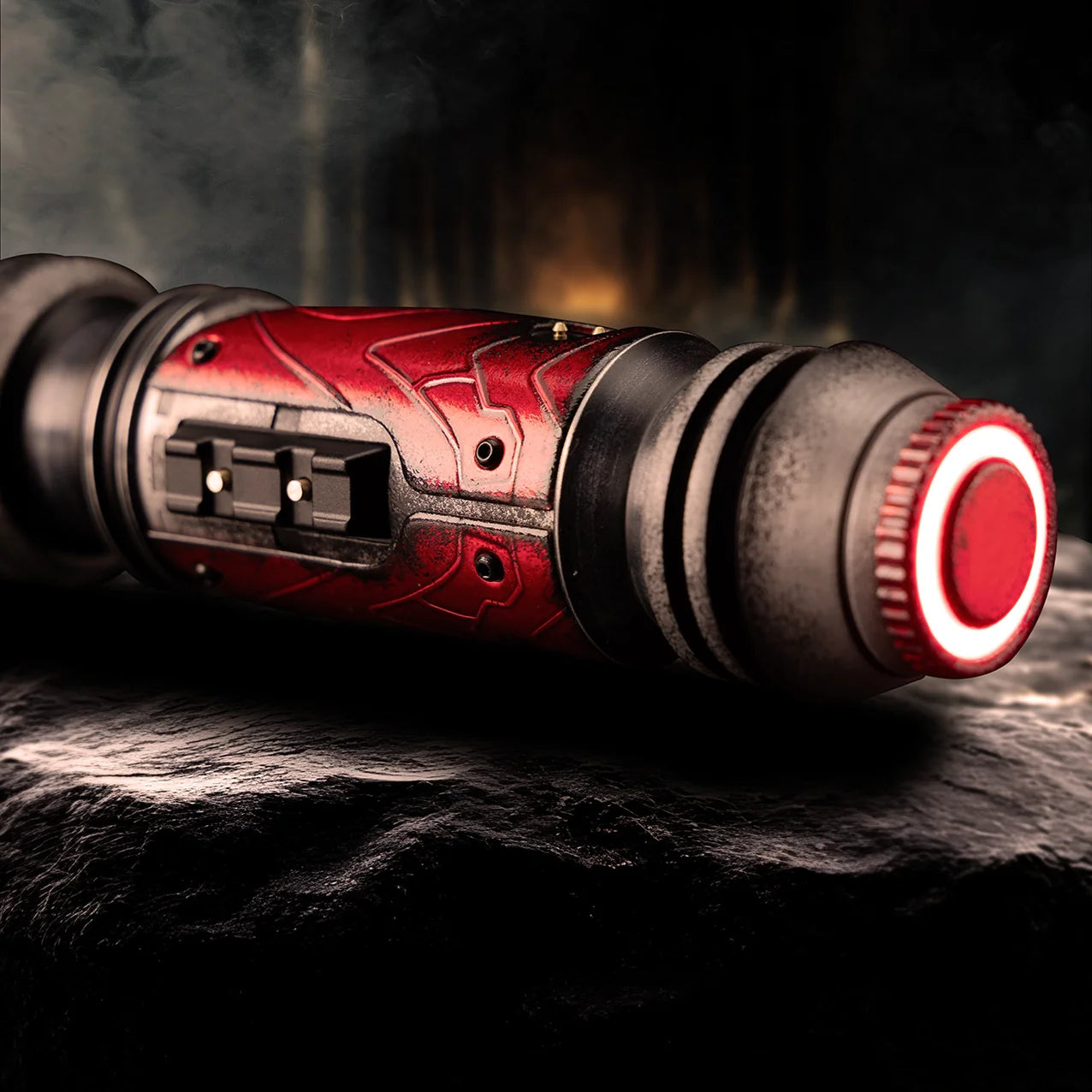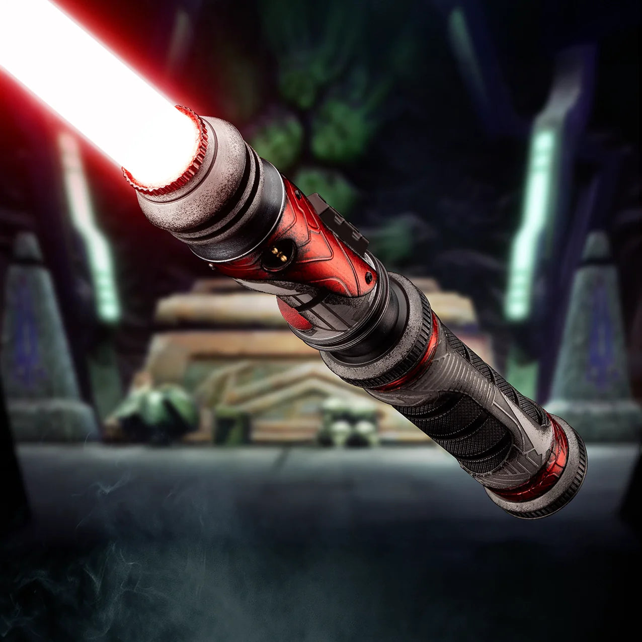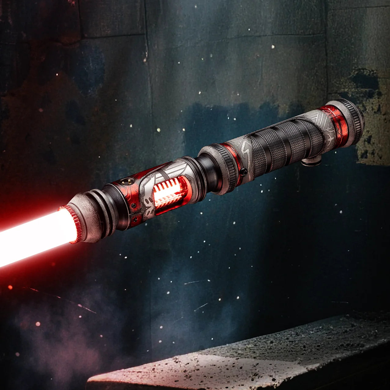 Les mythes prétendent que son instrument de mort n’était autre qu’un sabre laser — doté d’un cristal kyber exposé qui palpite encore, tel un cœur rouge sang à vif. La surface tourmentée de son métal ferait écho à l’armure agressive de son ancien propriétaire : une façade sauvage forgée par un réseau de lignes rigides gravées de l’émetteur jusqu’au pommeau, créant un visage féroce mêlant symétrie militaire et brutalité implacable.
